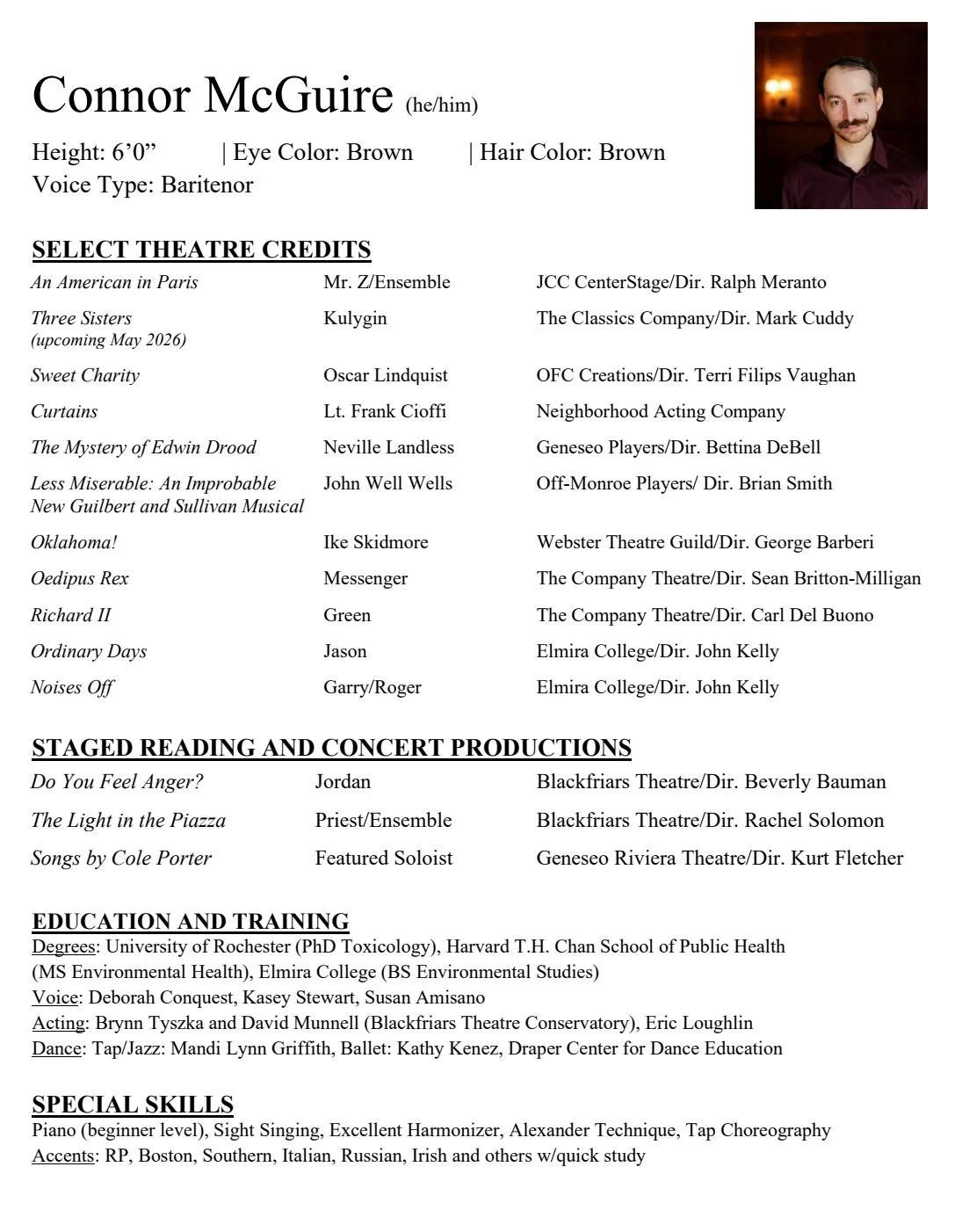 Connor McGuire is a professional actor and environmental toxicologist currently based in Rochester, NY.
